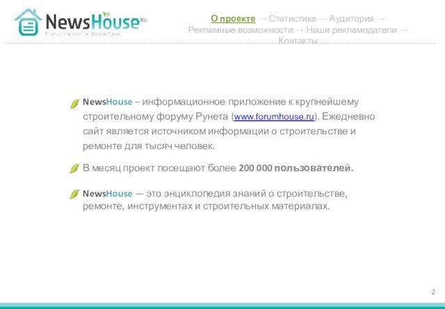 - 2. О проекте → Статистика → Аудитория → Рекламные возможности → Наши рекламодатели → Контакты