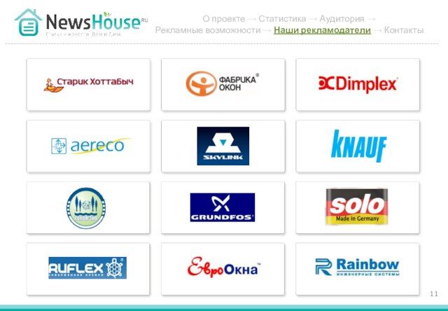 - 11. О проекте → Статистика → Аудитория → Рекламные возможности → Наши рекламодатели → Контакты