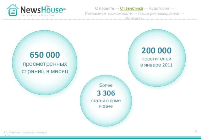 - 3. 650 000 просмотренных страниц в месяц Более 3 306 статей о доме и даче 200 000