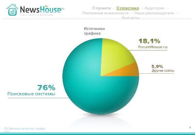 - 4. Источники трафика По данным LiveInternet: январь 2011 О проекте → Статистика → Аудитория → Рекламные возможности