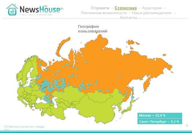 - 5. География пользователей По данным LiveInternet: январь 2011 О проекте → Статистика → Аудитория → Рекламные возможности