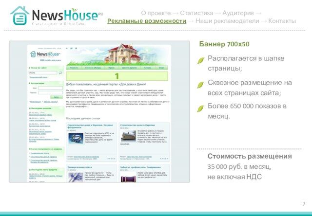 - 7. Располагается в шапке страницы; Баннер 700х50 Сквозное размещение на всех страницах сайта; Более 650 000 показов