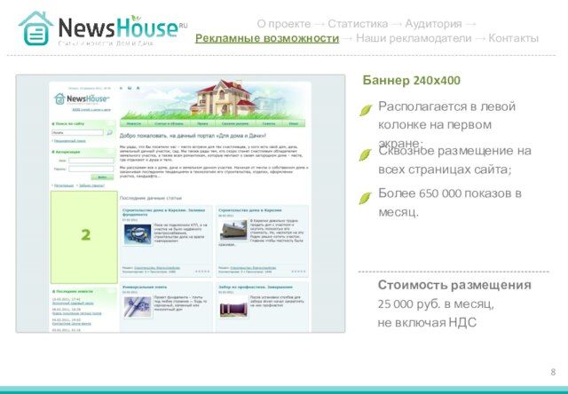 - 8. Располагается в левой колонке на первом экране; Баннер 240х400 Сквозное размещение на всех страницах сайта; Более