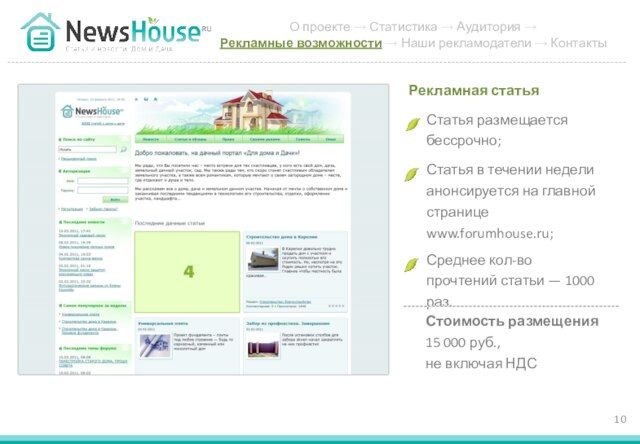 - 10. Статья размещается бессрочно; Рекламная статья Статья в течении недели анонсируется на главной странице www.forumhouse.ru; Среднее кол-во