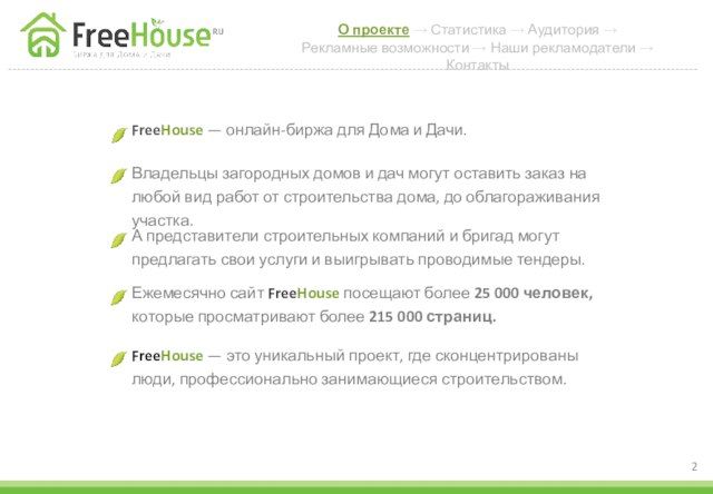 - 2. О проекте → Статистика → Аудитория → Рекламные возможности → Наши рекламодатели → Контакты