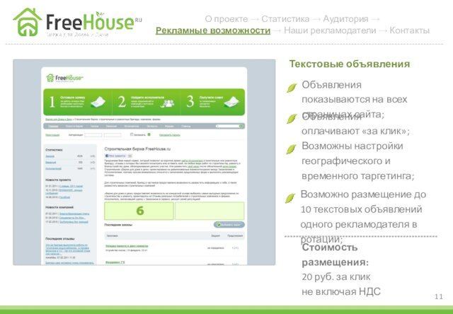 - 11. Объявления показываются на всех страницах сайта; Текстовые объявления Объявления оплачивают «за клик»; Возможны настройки географического и
