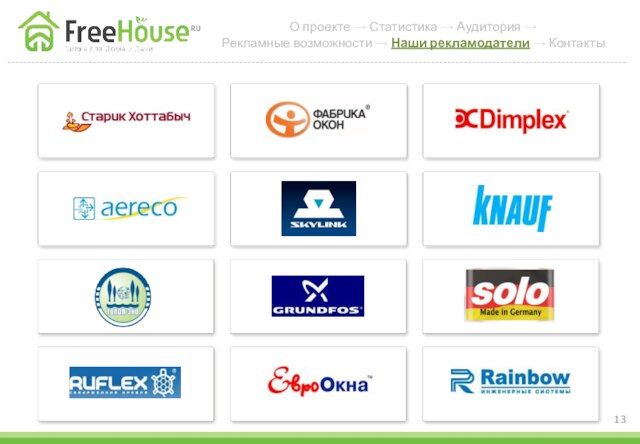 - 13. О проекте → Статистика → Аудитория → Рекламные возможности → Наши рекламодатели → Контакты