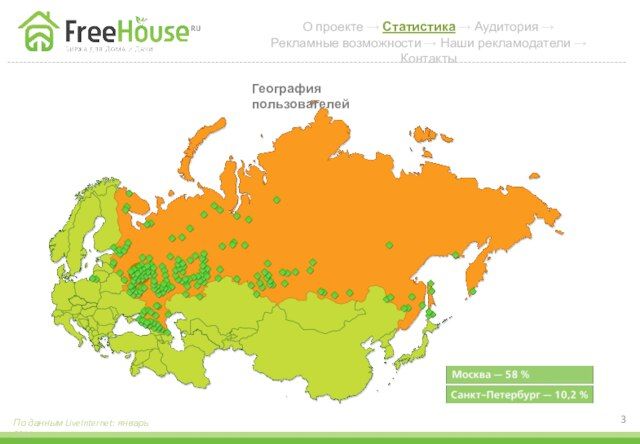 - 3. География пользователей По данным LiveInternet: январь 2011 О проекте → Статистика → Аудитория → Рекламные возможности