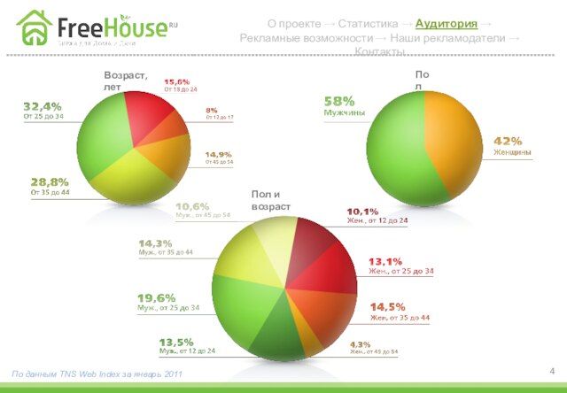 - 4. Возраст, лет По данным TNS Web Index за январь 2011 О проекте → Статистика → Аудитория