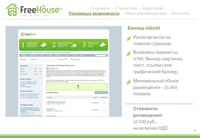 - 6. Располагается на главной странице; Баннер 600х90 Возможны варианты: HTML-баннер (картинка, текст, ссылки) или графический баннер; Минимальный