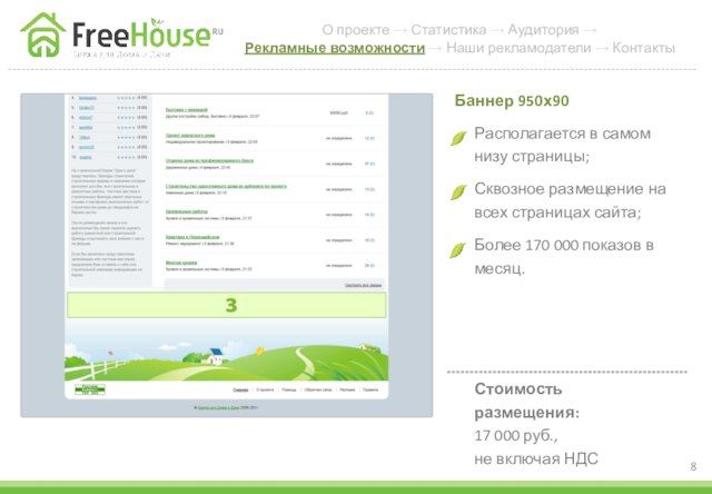 - 8. Располагается в самом низу страницы; Баннер 950х90 Сквозное размещение на всех страницах сайта; Более 170 000