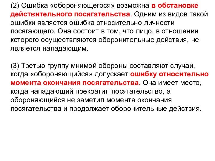 (2) Ошибка «обороняющегося» возможна в обстановке действительного посягательства. Одним из