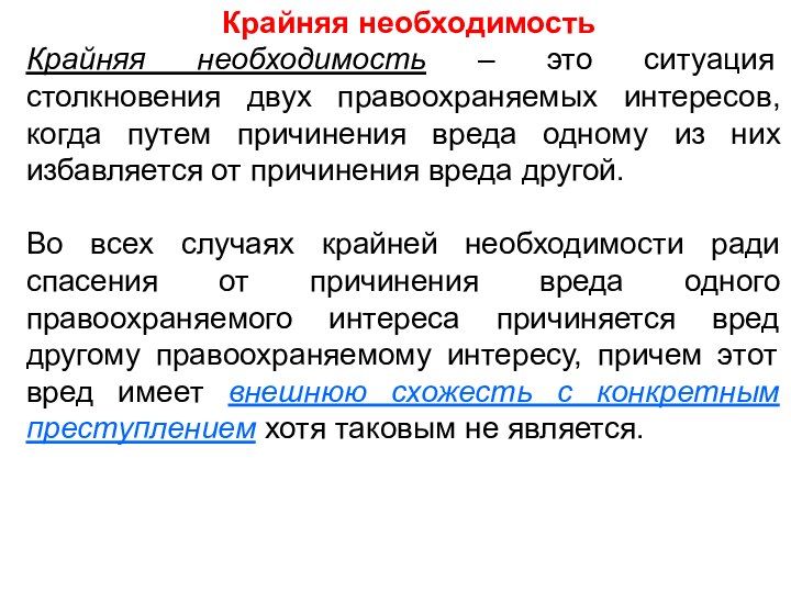 Во всех случаях крайней необходимости ради спасения от причинения вреда одного правоохраняемого интереса причиняется вред другому правоохраняемому интересу, причем этот вред имеет внешнюю схожесть с конкретным преступлением хотя таковым не является.