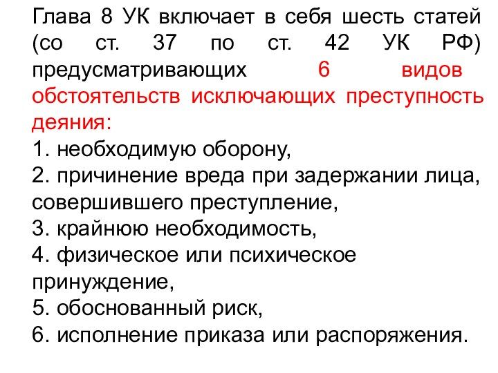 37 по ст. 42 УК РФ) предусматривающих 6 видов обстоятельств исключающих преступность деяния: