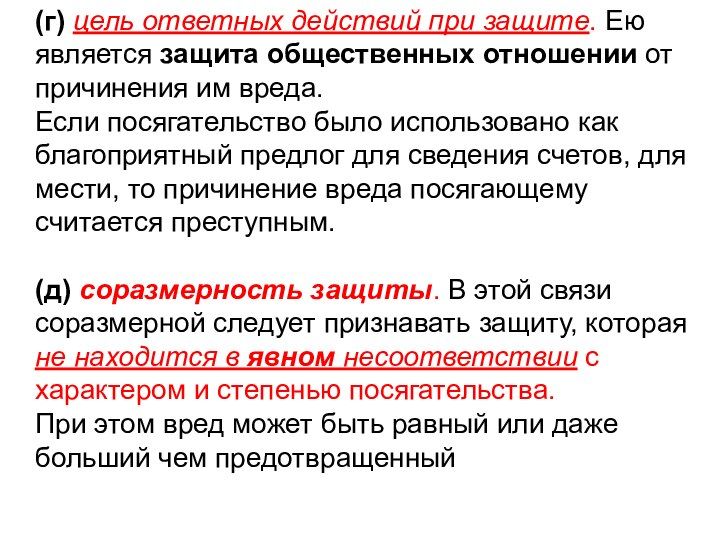 (д) соразмерность защиты. В этой связи соразмерной следует признавать защиту, которая не находится в явном несоответствии с характером и степенью посягательства.