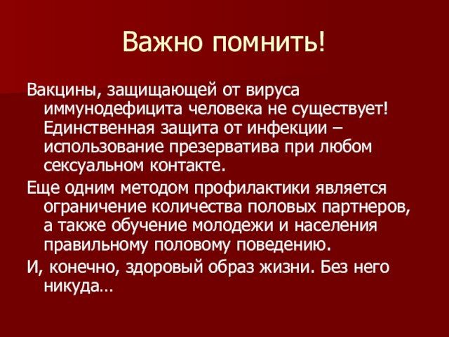 Важно помнить! Вакцины, защищающей от вируса иммунодефицита человека не существует! Единственная защита