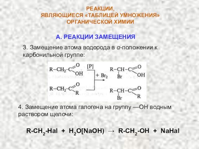 - 2. РЕАКЦИИ, ЯВЛЯЮЩИЕСЯ «ТАБЛИЦЕЙ УМНОЖЕНИЯ» ОРГАНИЧЕСКОЙ ХИМИИ 3. Замещение атома водорода в α-положении к карбонильной группе: 4.