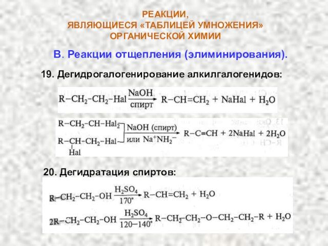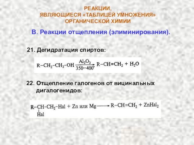 - 11. РЕАКЦИИ, ЯВЛЯЮЩИЕСЯ «ТАБЛИЦЕЙ УМНОЖЕНИЯ» ОРГАНИЧЕСКОЙ ХИМИИ 21. Дегидратация спиртов: В. Реакции отщепления (элиминирования). 22. Отщепление галогенов