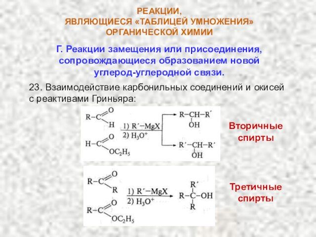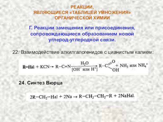 - 12. РЕАКЦИИ, ЯВЛЯЮЩИЕСЯ «ТАБЛИЦЕЙ УМНОЖЕНИЯ» ОРГАНИЧЕСКОЙ ХИМИИ Г. Реакции замещения или присоединения, сопровождающиеся образованием новой углерод-углеродной связи.