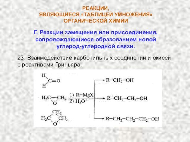 - 13. РЕАКЦИИ, ЯВЛЯЮЩИЕСЯ «ТАБЛИЦЕЙ УМНОЖЕНИЯ» ОРГАНИЧЕСКОЙ ХИМИИ Г. Реакции замещения или присоединения, сопровождающиеся образованием новой углерод-углеродной связи.