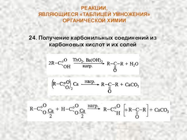 - 15. РЕАКЦИИ, ЯВЛЯЮЩИЕСЯ «ТАБЛИЦЕЙ УМНОЖЕНИЯ» ОРГАНИЧЕСКОЙ ХИМИИ 24. Получение карбонильных соединений из карбоновых кислот и их солей