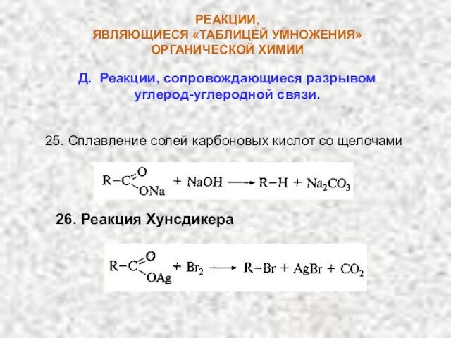 - 16. РЕАКЦИИ, ЯВЛЯЮЩИЕСЯ «ТАБЛИЦЕЙ УМНОЖЕНИЯ» ОРГАНИЧЕСКОЙ ХИМИИ Д. Реакции, сопровождающиеся разрывом углерод-углеродной связи. 25. Сплавление солей карбоновых