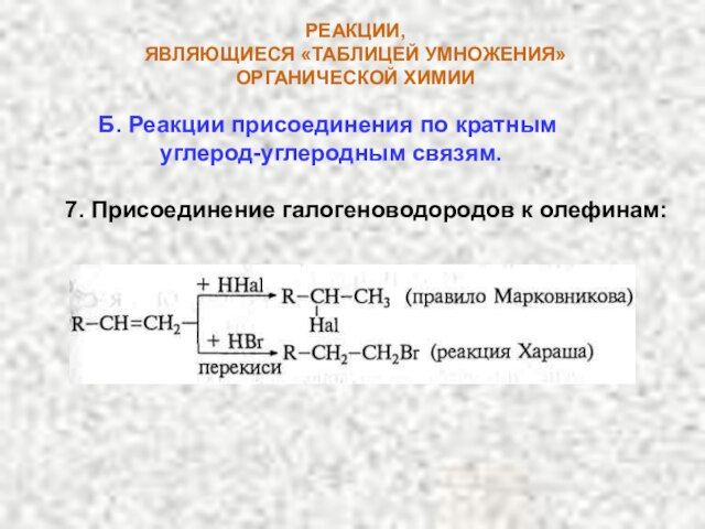- 4. РЕАКЦИИ, ЯВЛЯЮЩИЕСЯ «ТАБЛИЦЕЙ УМНОЖЕНИЯ» ОРГАНИЧЕСКОЙ ХИМИИ Б. Реакции присоединения по кратным углерод-углеродным связям. 7. Присоединение галогеноводородов