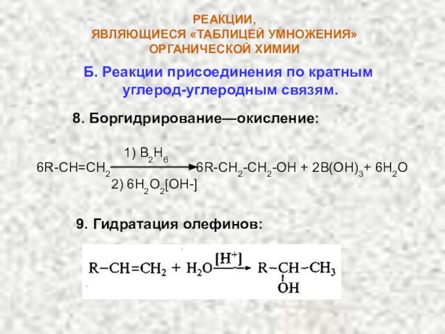 - 5. Б. Реакции присоединения по кратным углерод-углеродным связям. 8. Боргидрирование—окисление: 6R-CH=CH2 6R-CH2-CH2-OH + 2В(ОН)3+ 6Н2О 2) 6Н2О2[ОН-]