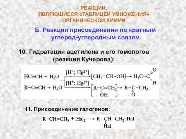- 6. Б. Реакции присоединения по кратным углерод-углеродным связям. РЕАКЦИИ, ЯВЛЯЮЩИЕСЯ «ТАБЛИЦЕЙ УМНОЖЕНИЯ» ОРГАНИЧЕСКОЙ ХИМИИ 10. Гидратация ацетилена