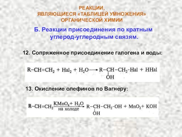 - 7. Б. Реакции присоединения по кратным углерод-углеродным связям. РЕАКЦИИ, ЯВЛЯЮЩИЕСЯ «ТАБЛИЦЕЙ УМНОЖЕНИЯ» ОРГАНИЧЕСКОЙ ХИМИИ 12. Сопряженное присоединение