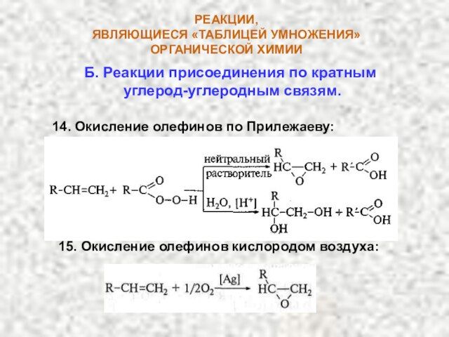 - 8. РЕАКЦИИ, ЯВЛЯЮЩИЕСЯ «ТАБЛИЦЕЙ УМНОЖЕНИЯ» ОРГАНИЧЕСКОЙ ХИМИИ Б. Реакции присоединения по кратным углерод-углеродным связям. 14. Окисление олефинов