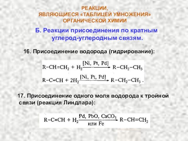 - 9. РЕАКЦИИ, ЯВЛЯЮЩИЕСЯ «ТАБЛИЦЕЙ УМНОЖЕНИЯ» ОРГАНИЧЕСКОЙ ХИМИИ 16. Присоединение водорода (гидрирование): Б. Реакции присоединения по кратным углерод-углеродным