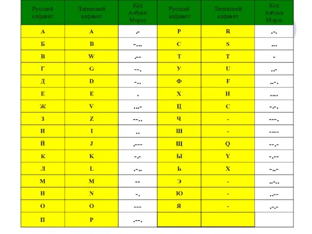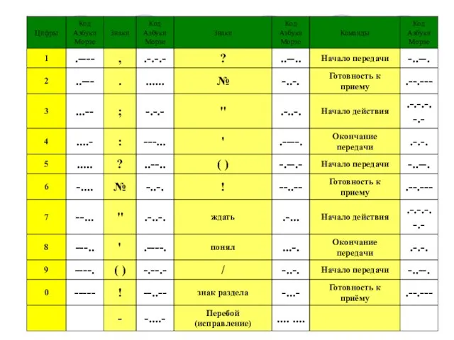 - 25. Характеристики кода Морзе Вероятности точки, тире, пауз. Энтропия. Избыточность. Скорость передачи.