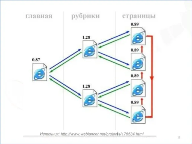 - 12. ИСТОРИЯ РАЗВИТИЯ ПОИСКОВЫХ СИСТЕМ Учет внешних факторов PageRank (PR) - Google Метод вычисления веса страницы путем