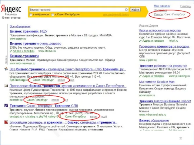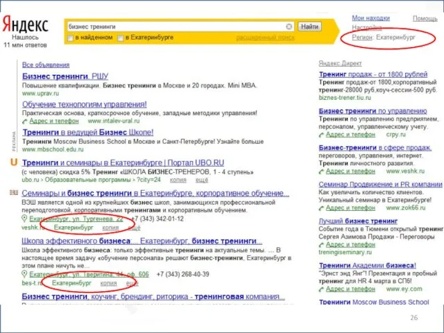 - 27. ГЕОГРАФИЯ Обязательное наличие УНИКАЛЬНОГО адреса, телефона на каждый регион. Уникальные реквизиты Очень желательная регистрация в Яндекс.Каталоге