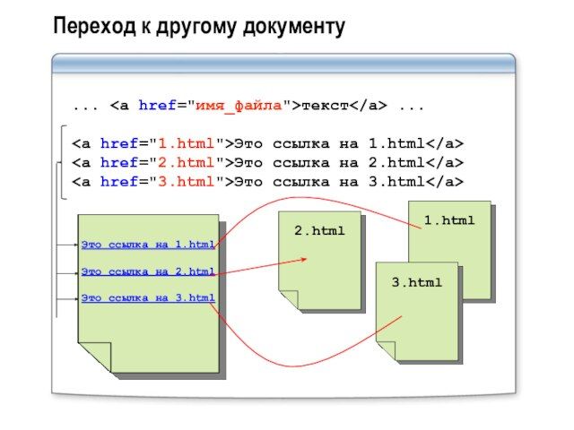 - 4. Переход к другому документу Это ссылка на 1.html Это ссылка на 2.html Это ссылка на 3.html
