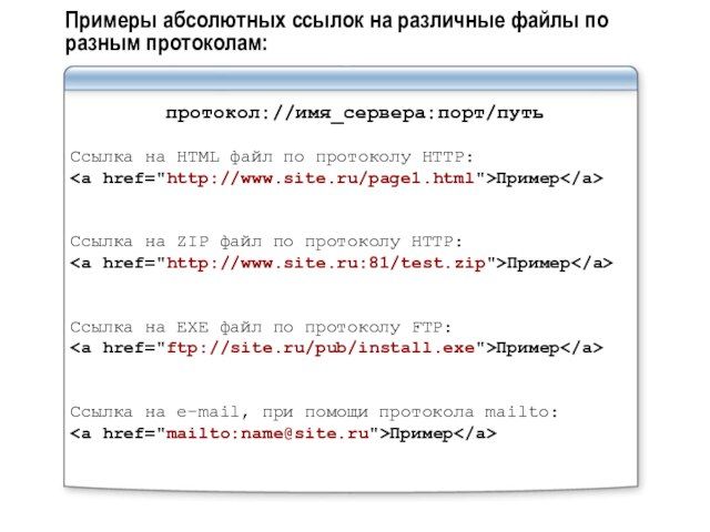 - 7. Примеры абсолютных ссылок на различные файлы по разным протоколам: протокол://имя_сервера:порт/путь Ссылка на HTML файл по протоколу