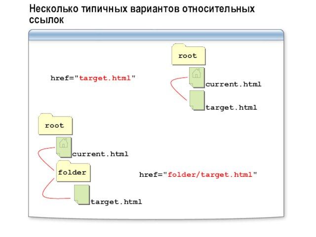 - 8. Несколько типичных вариантов относительных ссылок href="target.html" href="folder/target.html"