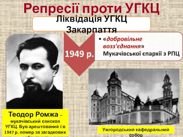 - 32. Репресії проти УГКЦ Ліквідація УГКЦ 1946 р. Гавриїл Костельник – представник ініціативної групи щодо розірвання унії